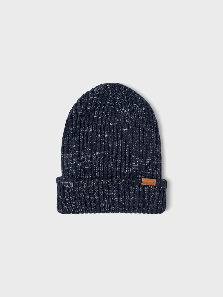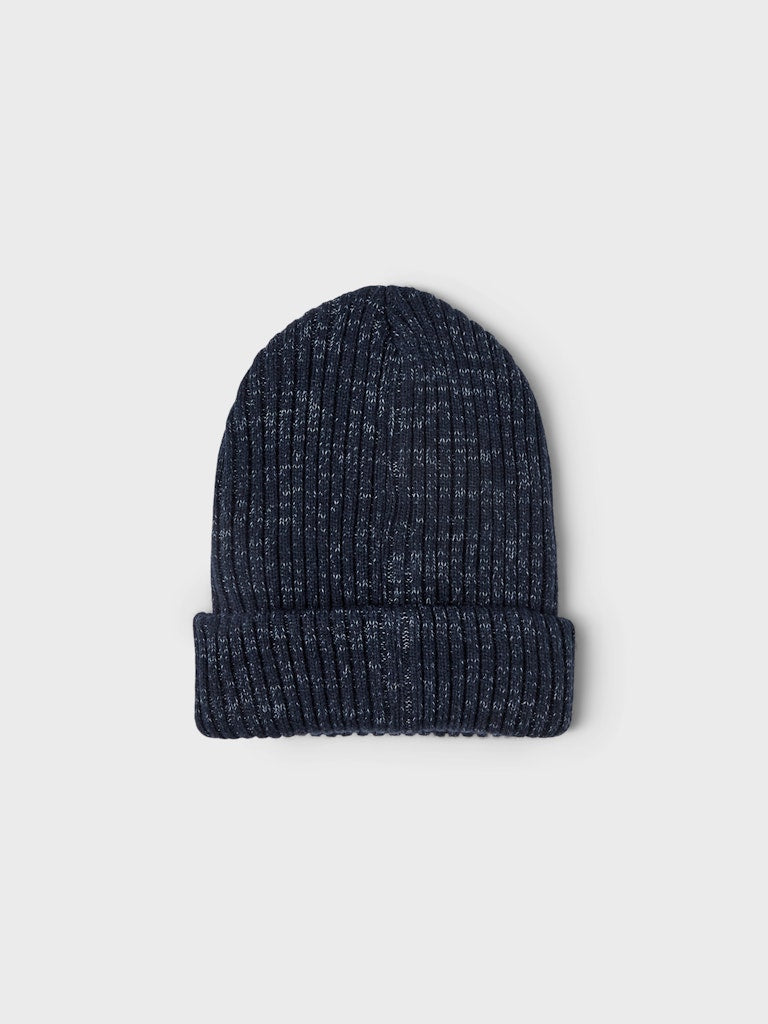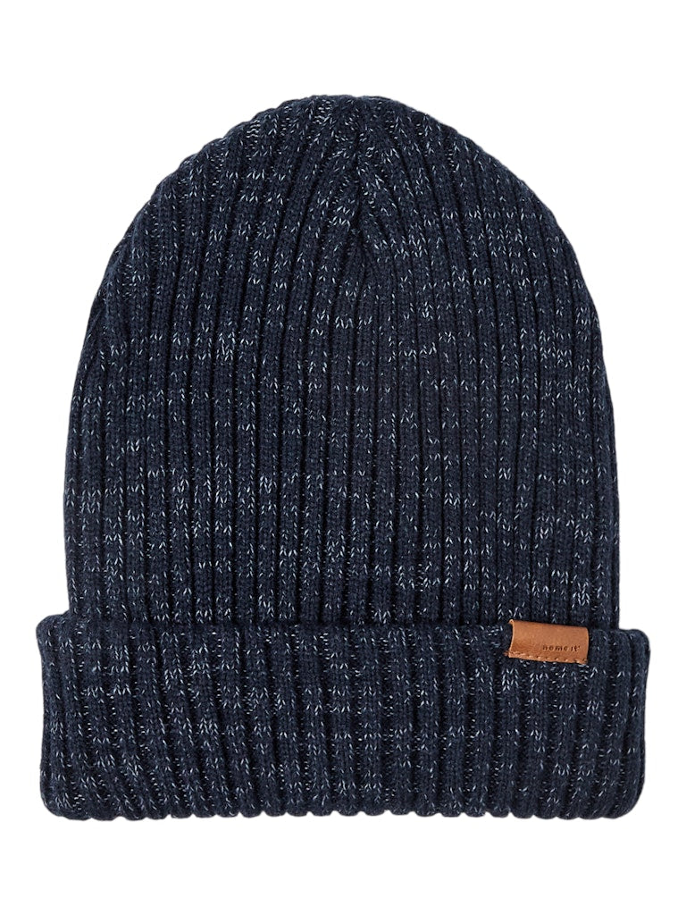 Ribbstickad blåmelerad mössa till kids med uppvikt kant.