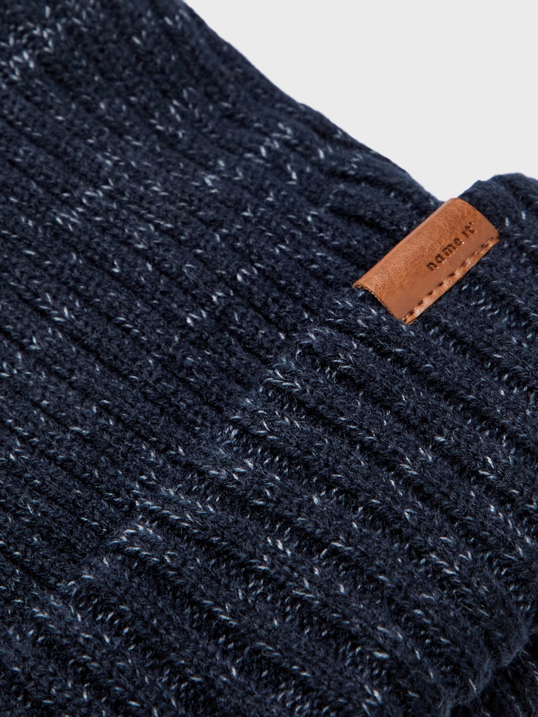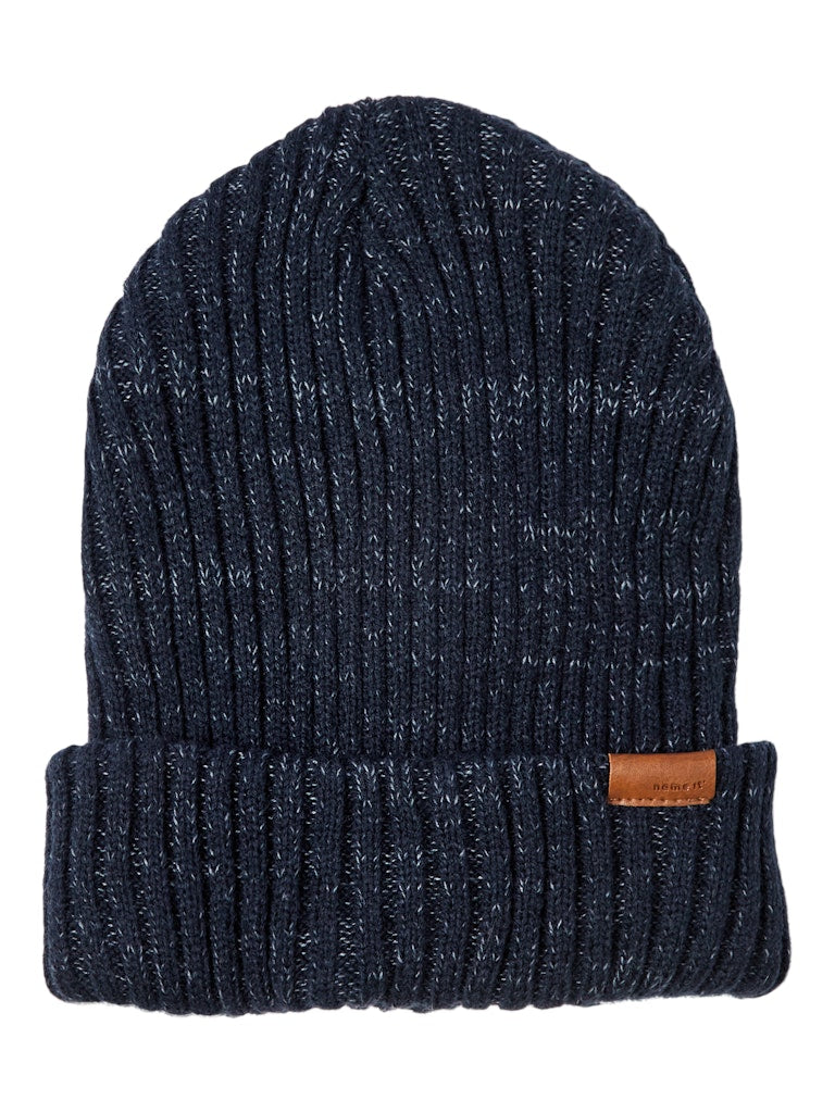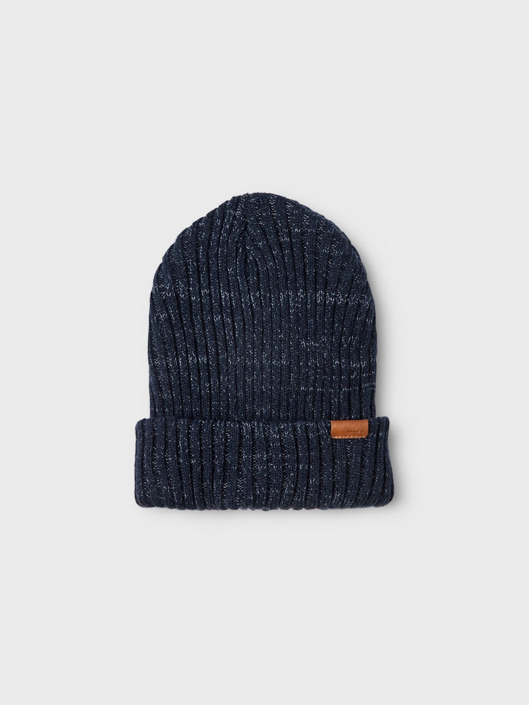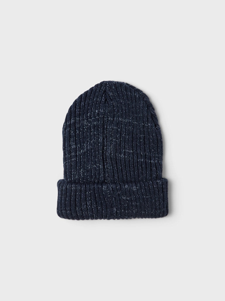 Ribbstickad blåmelerad mössa till barn med uppvikt kant.
