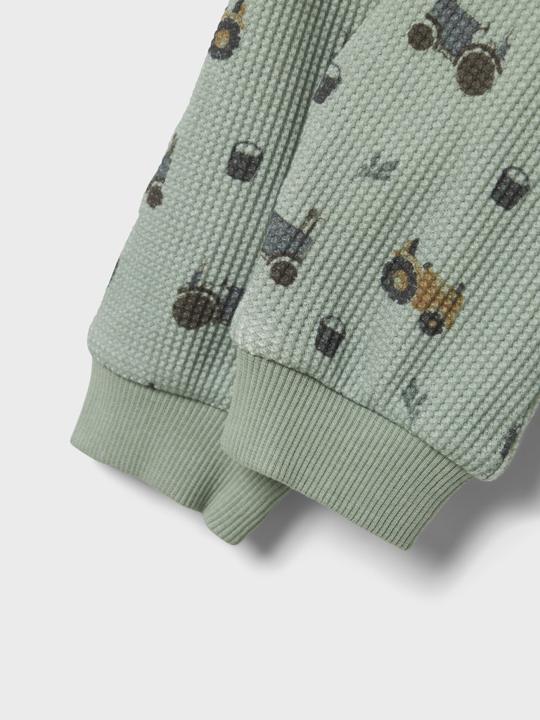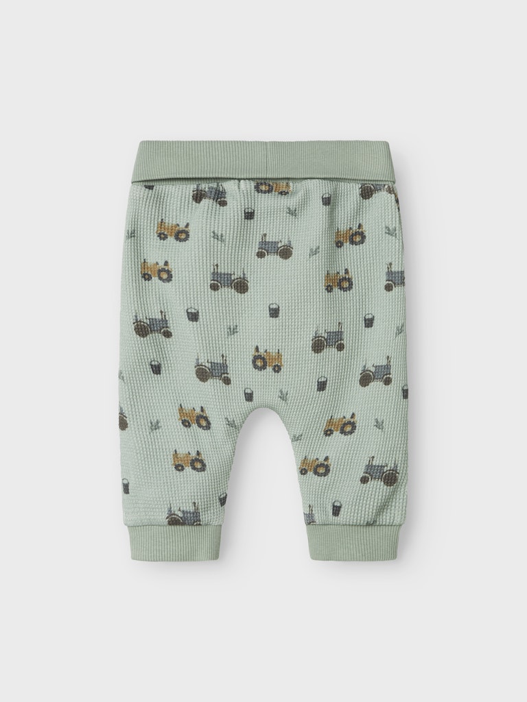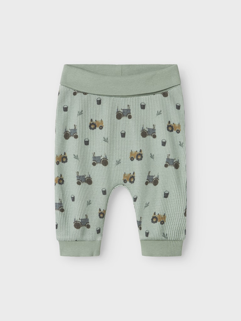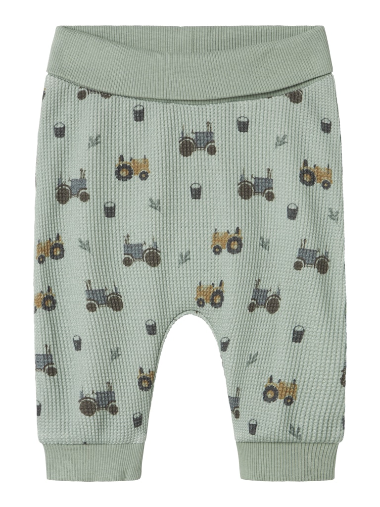 Fin byxa till baby i mjuk våfflad ekologisk bomull med små traktorer