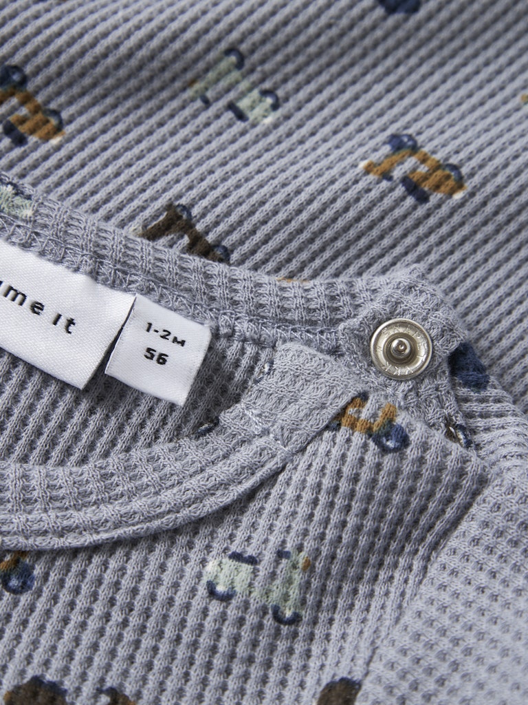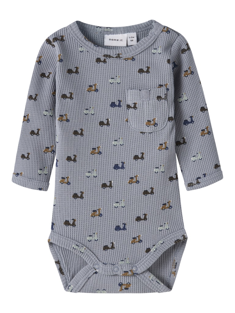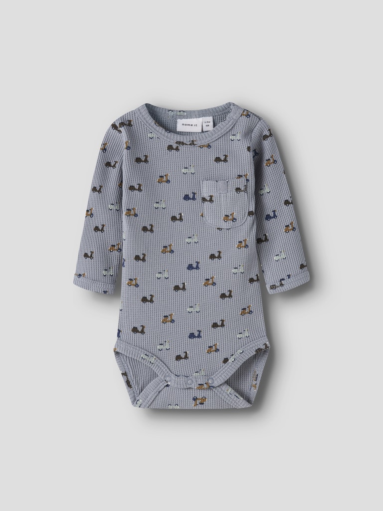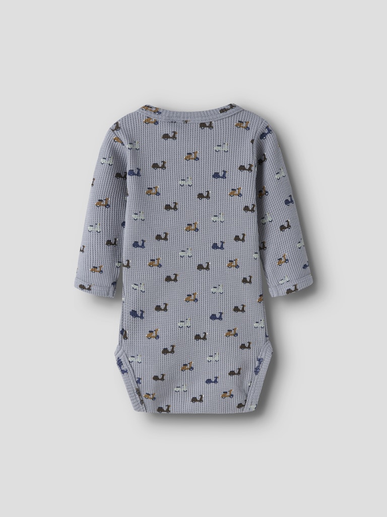 Mjuk långärmad body till baby i våfflad ekologisk bomull med motiv av vespor.