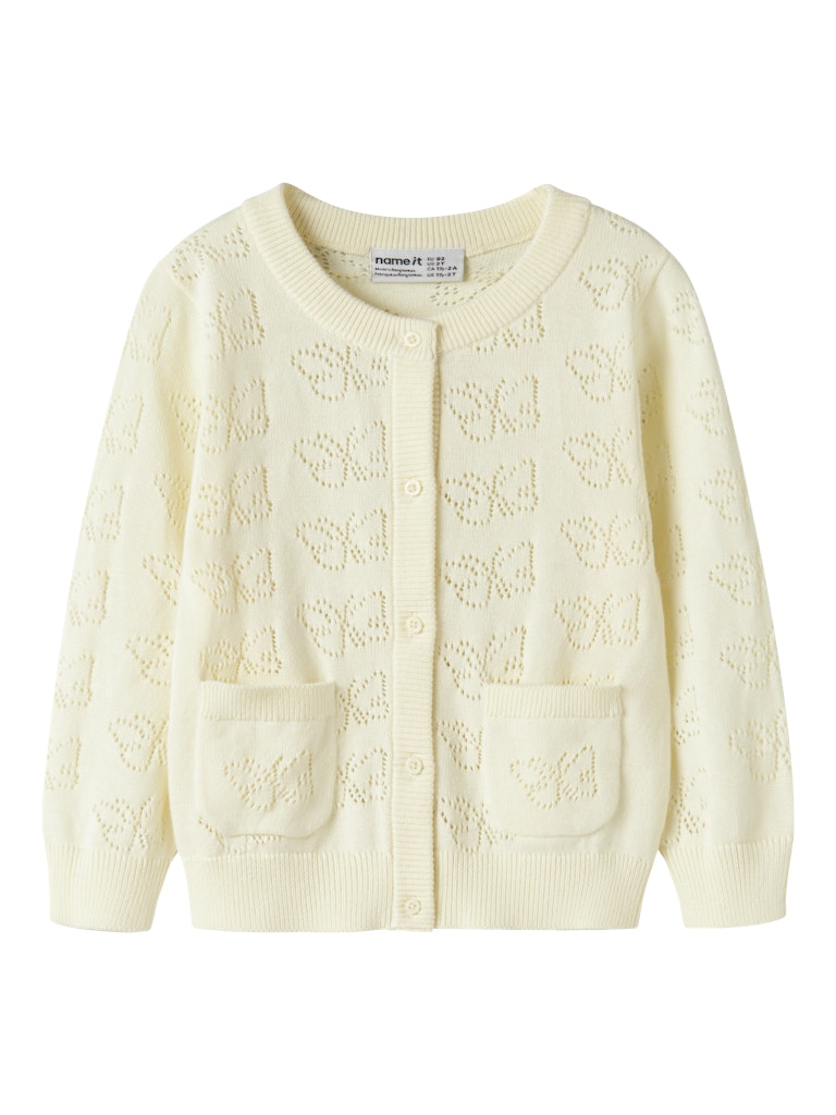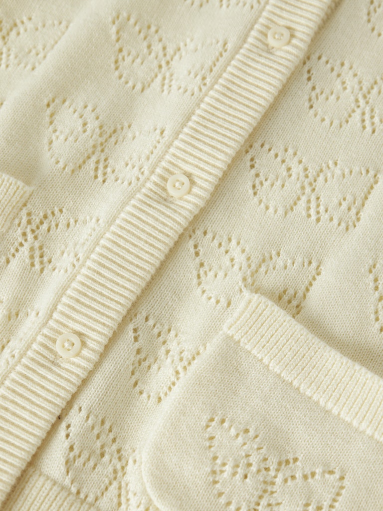 Underbar hålmönstrad stickad kofta i ekologisk bomull med fina knappar och små fickor fram.