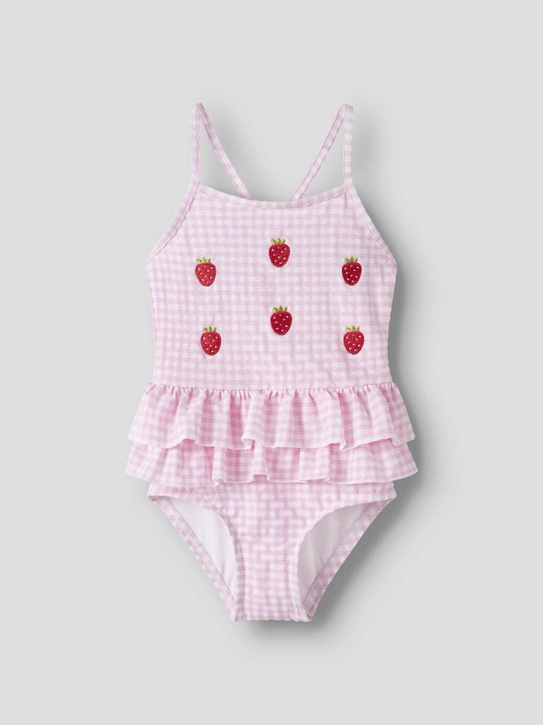Supergullig rutig baddräkt med små broderade jordgubbar.
