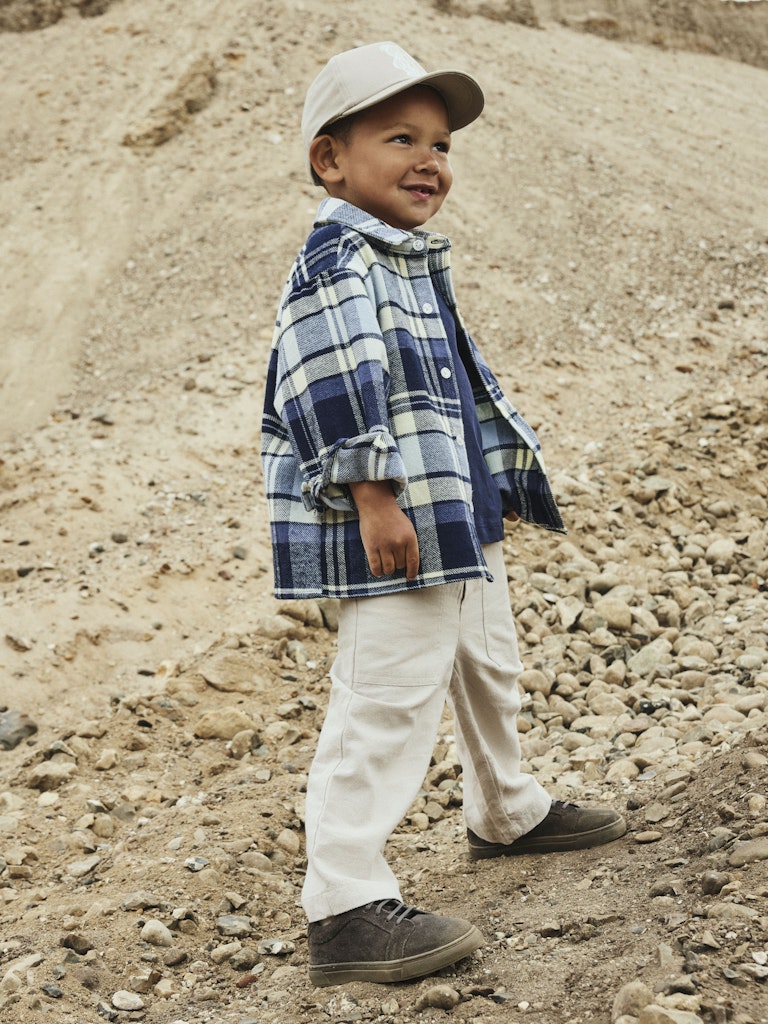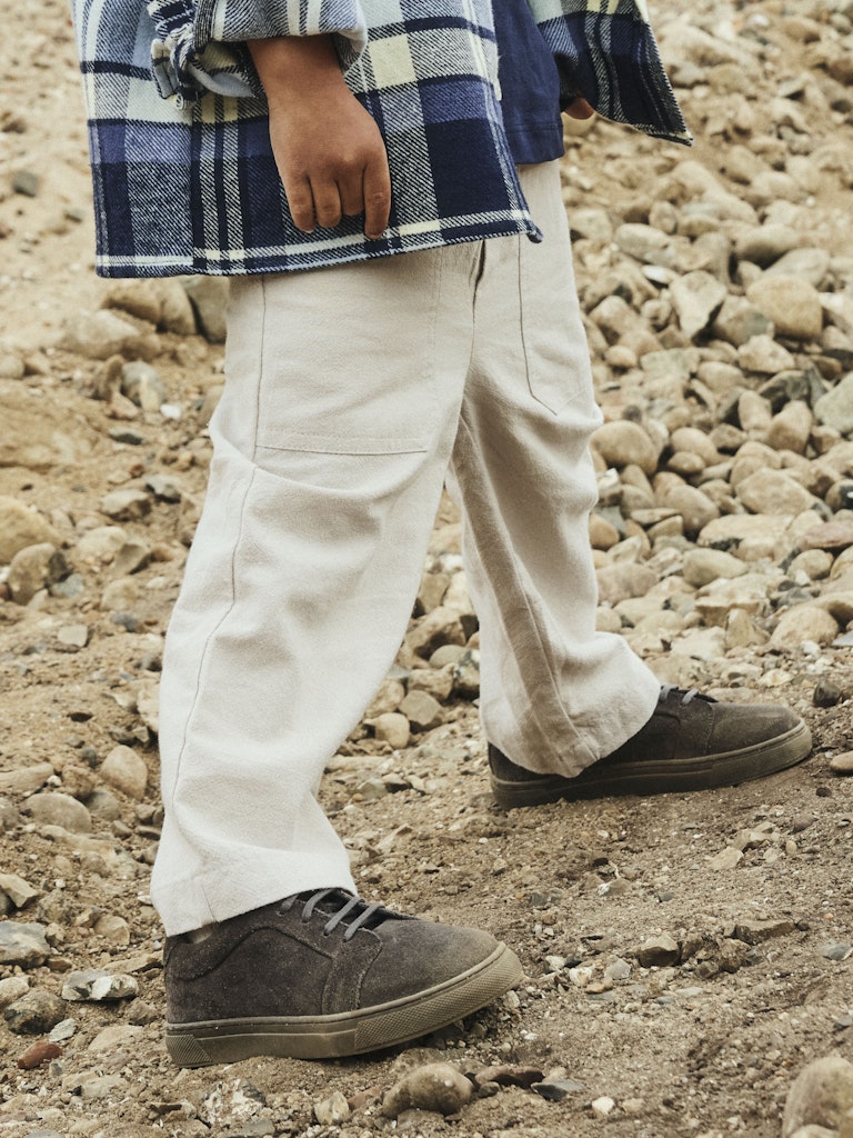 Byxa till barn i mjuk vävd bomull med reglerbar resårmidja och framfickor