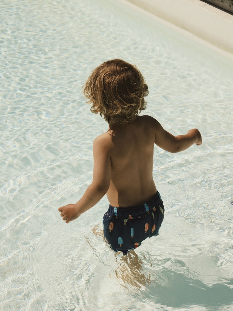Coola mönstrade badshorts med glassar. Praktisk reglerbar midja, fast dragsko och innershorts.