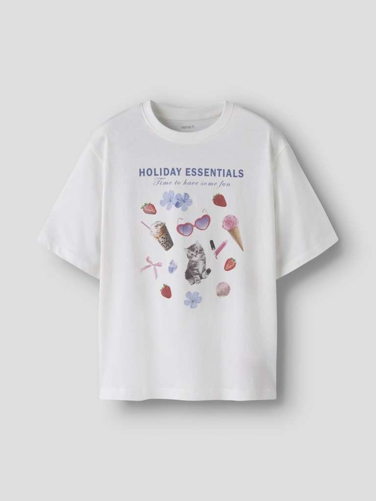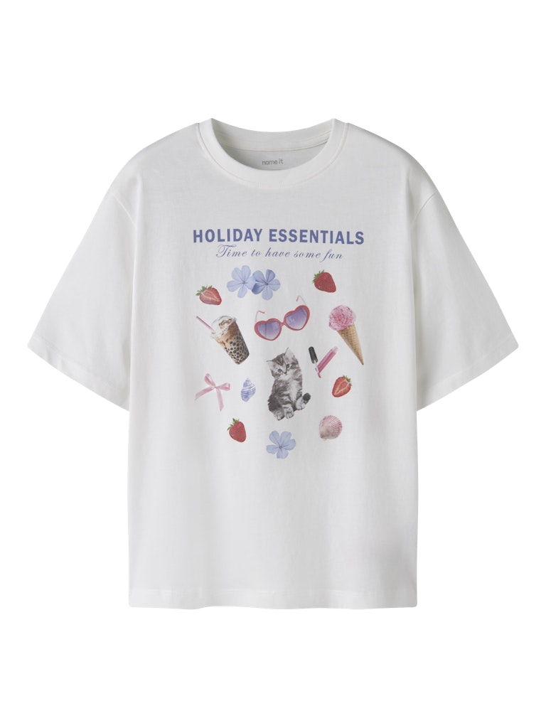 T-shirt till kids med rund halsringning och tryck med frukter, glass, katt och blommor mitt fram.