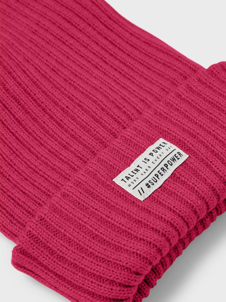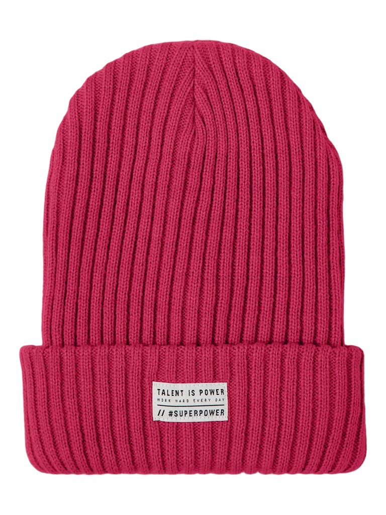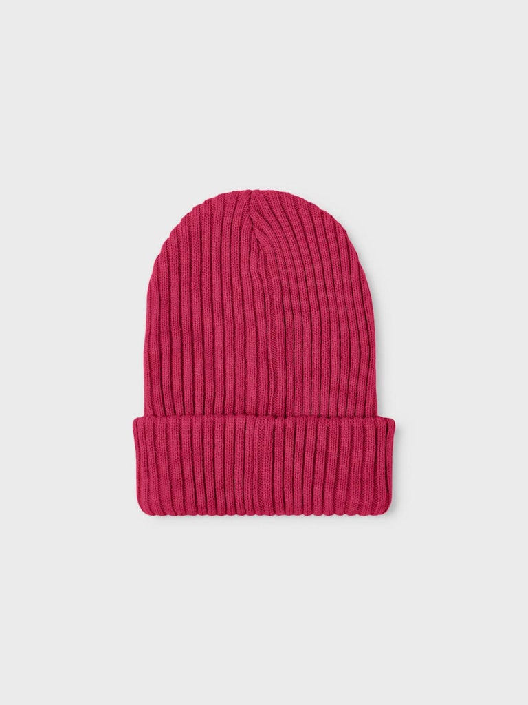 Ribbstickad röd mössa till kids med uppvikt kant.